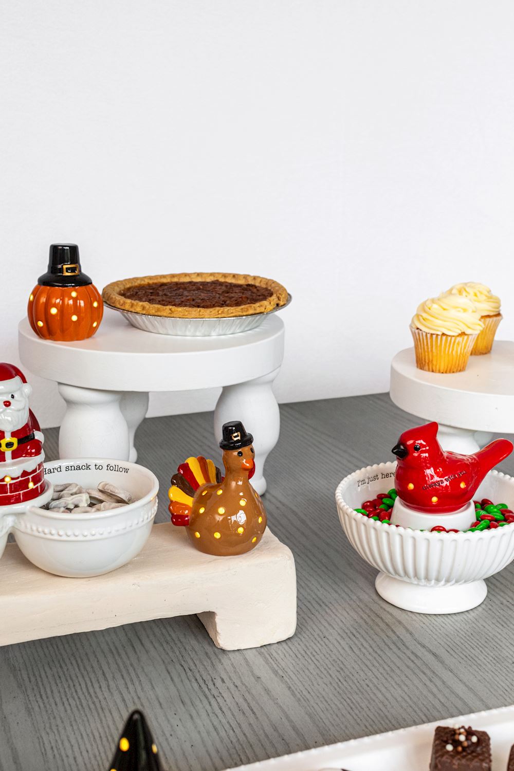 This Jack-O-Lantern lights up. It can be used as an accent piece alone, or as a pumpkin sitter inside the fluted candy bowl (featured in our other products) or the divided platter (also featured in our other products. This piece is sold separately but is a great option to be used with all of the other holiday sitters that pair with the fluted bowl and divided platter.